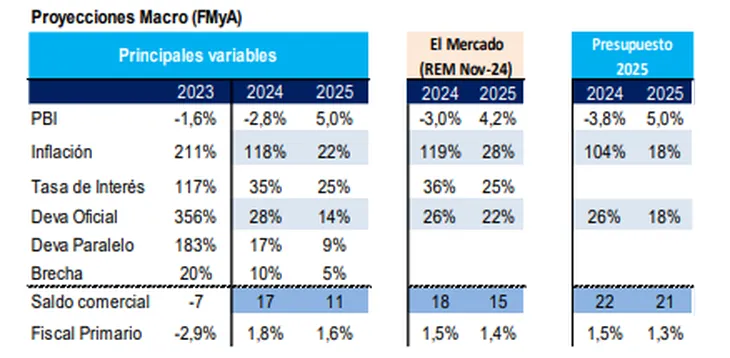 Respecto del tipo de cambio, en FMyA pronostican una reducción del «crawling peg» mensual hacia la zona del 1% a partir de febrero, lo cual redundaría en un ajuste del dólar oficial de apenas 14% durante todo 2025. En cuanto al cepo, consideran que habrá una «liberación muy paulatina».