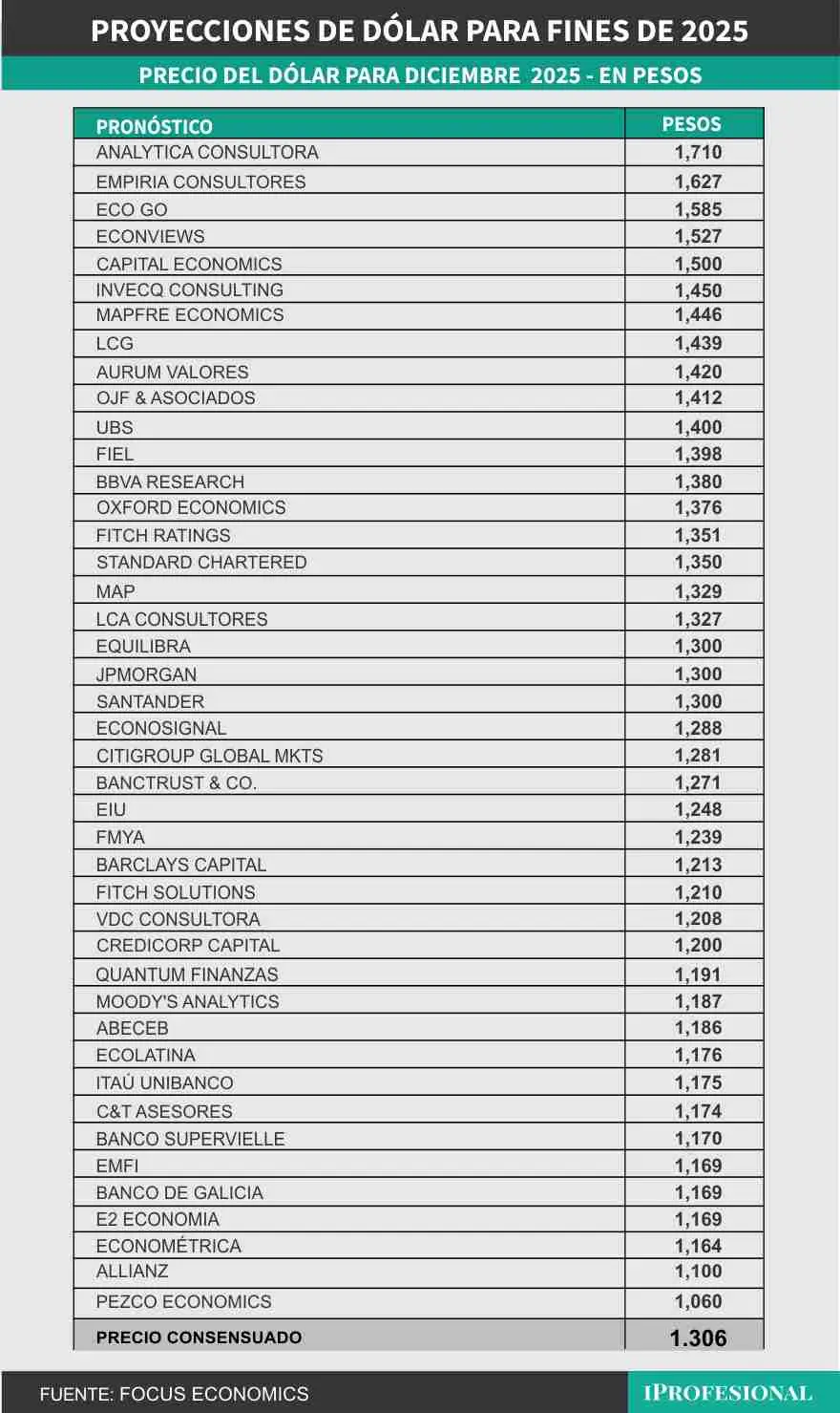 En tanto, Fernando Baer, economista de Quantum (Marx), que en el FocusEconomics preveía $1.191, afirma que post levantamiento del cepo, «lógicamente, cambiamos las proyecciones y esperamos que esté más arriba de eso a fin de año, en niveles de $1.250 a 1.300 pesos».