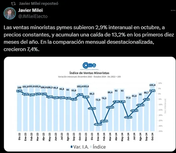 «Buen domingo para aquellos que intentaron durante décadas hacernos creer que imprimiendo dinero para aumentar el gasto mejora la economía. Aquí la evolución de las ventas minoristas. La evidencia no perdona», sostuvo el legislador.