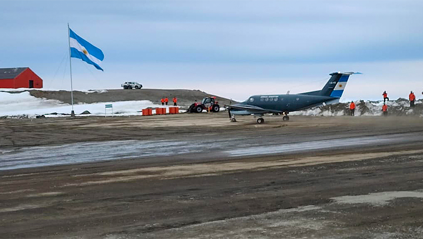 Un TC-12B Hurón de la Escuadrilla Aeronaval de Vigilancia Marítima voló desde la Base Aeronaval Río Grande a la Base Antártica Conjunta Petrel. Hace más de 51 años que la Armada no operaba con aeronaves de ala fija desde pistas en la Antártida.