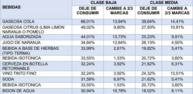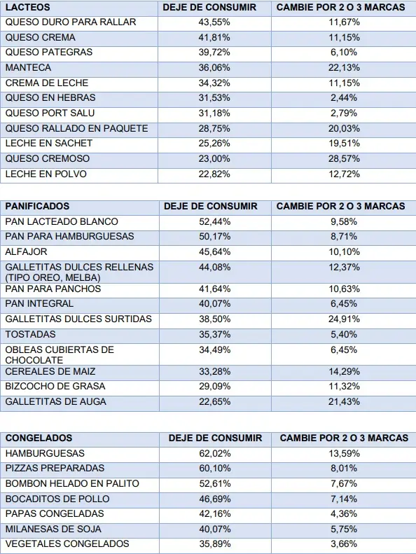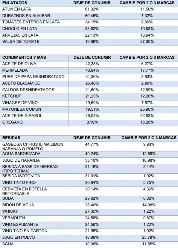 En cuanto al resto de los productos, en la consulta sobre si su consumo había variado, se les pidió a los encuestados que la respuesta indicara si se habían dejado de consumir o si se había optado por segundas o terceras marcas. Este fue el resultado: