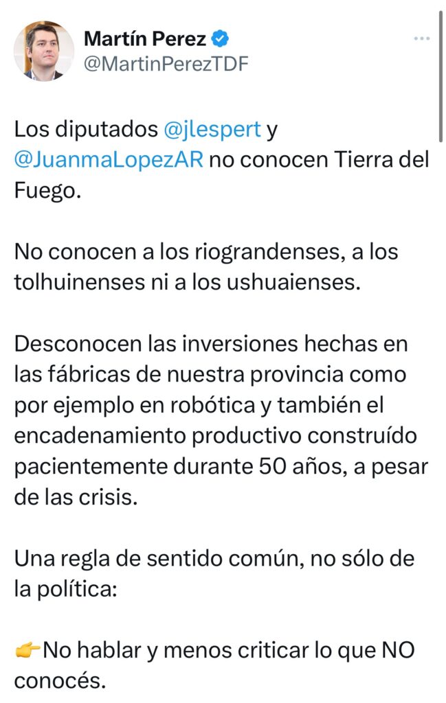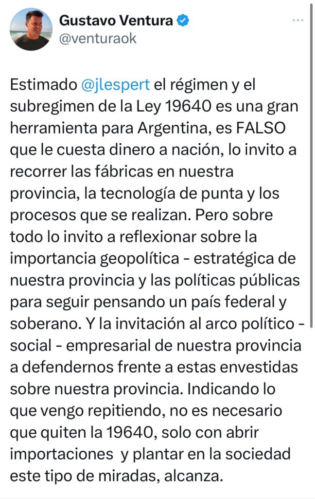 Fue un ataque directo a la industria fueguina, la ley 19640 y el subrégimen industrial lo que hizo el diputado José Luis Espert. Pero el arco político fueguino parece estar preocupado por otras cuestiones, quizás más ligadas a la posible convención constituyente. La realidad es que las únicas voces que se oyeron fueron la del intendente de Rio Grande Martín Pérez, la ex Gobernadora Rosana Bertone y el ex miembro de la Comisión del área aduanera especial, secretario de turismo y referente político de Ushuaia Gustavo Ventura.