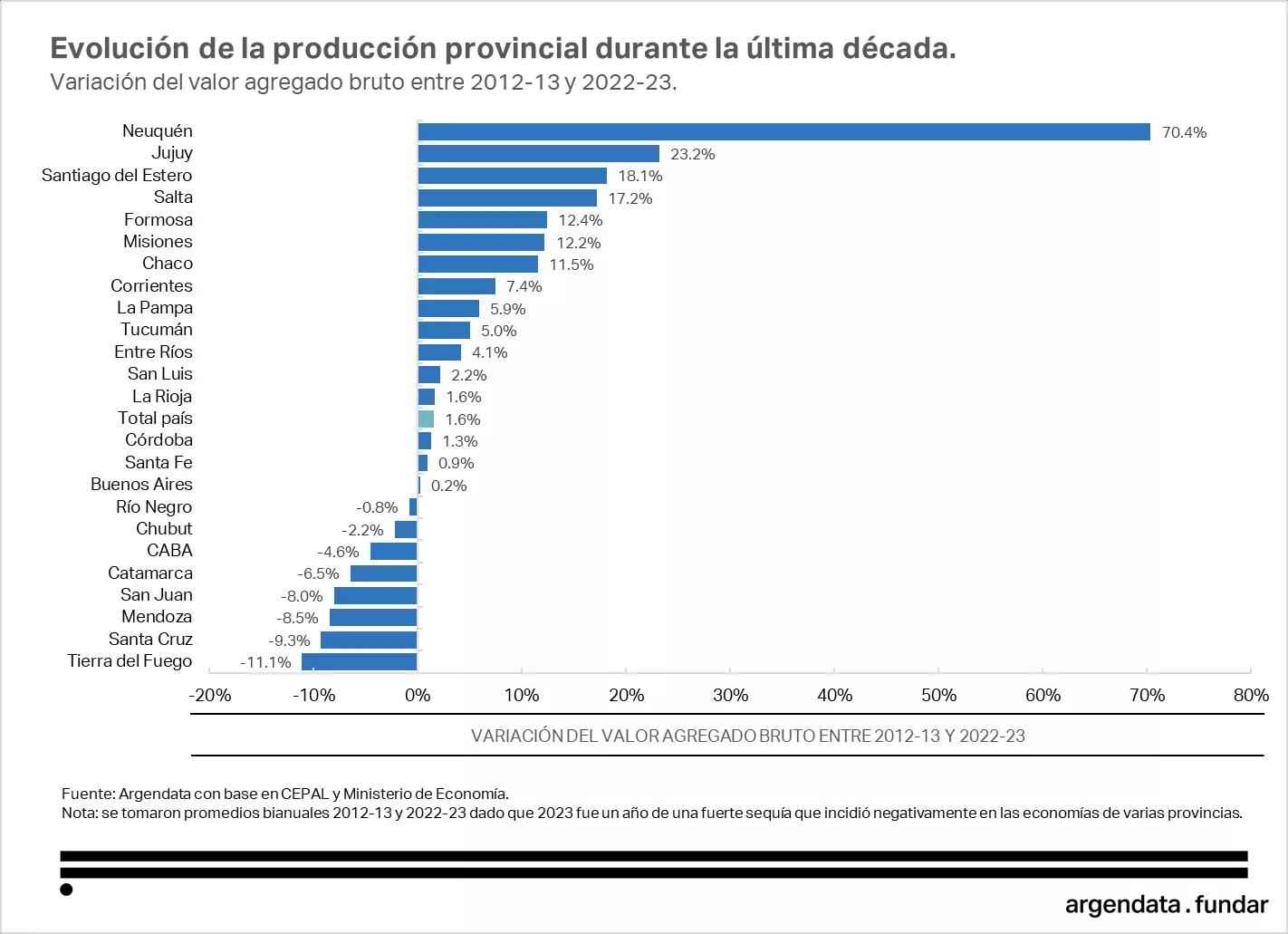 Según el estudio de la CEPAL, titulado «Desagregación provincial del valor agregado bruto de la Argentina, base 2004», actualizado recientemente a 2023, el estancamiento general de la economía argentina a nivel nacional contrastó fuertemente con el dinamismo de provincias como Neuquén, cuyo crecimiento del 70% se explica por el auge de la explotación de hidrocarburos no convencionales en Vaca Muerta. Jujuy también experimentó un crecimiento significativo del 23%, impulsado principalmente por la creciente actividad en la extracción de litio.
