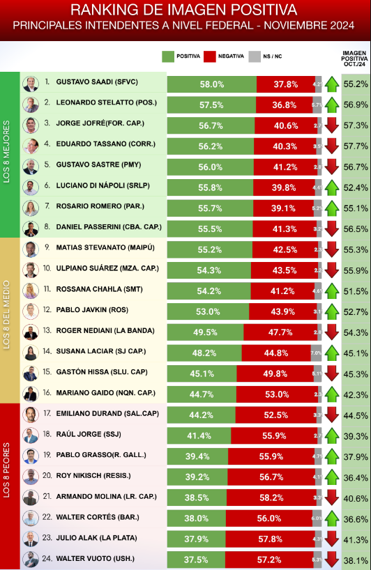 En la encuesta de la Consultora CB, los tres intendentes mejores valorados en noviembre por sus vecinos son: en primer lugar Gustavo Saadi de San Fernando del Vale de Catamarca con el 58% de aprobación, seguido por Leoonardo Stelatto de Posadas con el 57,5% y Jorge Jofré de Formosa Capital con el 56,7% de imagen positiva.